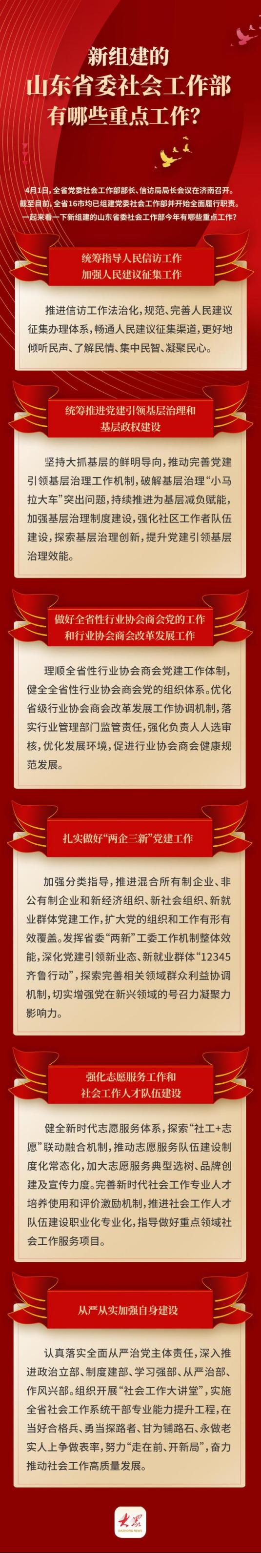 会议要求,全省各级党委社会工作部要统筹指导人民信访工作,加强人民建议征集工作。统筹推进党建引领基层治理和基层政权建设,推动完善党建引领基层治理工作机制,破解基层治理“小马拉大车”突出问题,着力为基层减负赋能。坚持党对行业协会商会的全面领导,加强全省性行业协会商会党的工作,协调推动行业协会商会深化改革和转型发展,充分发挥行业协会商会在服务经济社会发展中的作用。扎实做好混合所有制企业、非公有制企业和新经济组织、新社会组织、新就业群体党建工作,发挥省委“两新”工委工作机制整体效能,深化党建引领新业态、新就业群体“12345齐鲁行动”,探索完善相关领域群众利益协调机制,推动“两企三新”党建工作提质增效。健全新时代志愿服务体系,推动志愿服务队伍建设制度化常态化,完善新时代社会工作专业人才培养使用和评价激励机制,推进社会工作人才队伍建设职业化专业化。落实全面从严治党主体责任,深入推进政治立部、制度建部、学习强部、从严治部、作风兴部,组织开展“社会工作大讲堂”,实施全省社会工作系统干部专业能力提升工程,在当好合格兵、勇当探路者、甘为铺路石、永做老实人上争做表率,奋力开创全省社会工作新局面。
