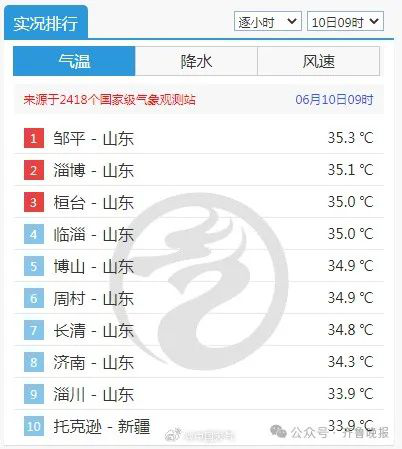 山东邹平以35.3℃排行第一
