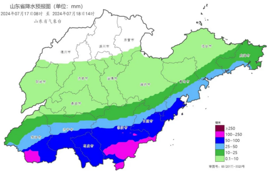 山东省气象台于7月17日09时00分发布暴雨黄色预警:受副高边缘暖湿气流和冷空气共同影响,15日下午至16日夜间,鲁中、鲁南和半岛的部分地区出现大到暴雨局部大暴雨,鲁西北地区出现小到中雨局部大雨。预计17日白天到18日上午,鲁南地区仍将有强降雨,部分地区有短时强降水和雷电,最大1小时降水量40~80毫米,雷雨地区雷雨时阵风8~10级,局部11级。全省累积平均降水量15~25毫米。其中,菏泽南部、济宁南部、枣庄、临沂南部、日照和青岛南部有大到暴雨局部大暴雨(40~70毫米局部150~250毫米),菏泽北部、济宁北部、临沂北部、聊城、泰安、济南、淄博南部、潍坊、青岛北部、烟台和威海有小到中雨局部大雨(5~15毫米局部25毫米以上),其他地区局部有雷雨或阵雨。