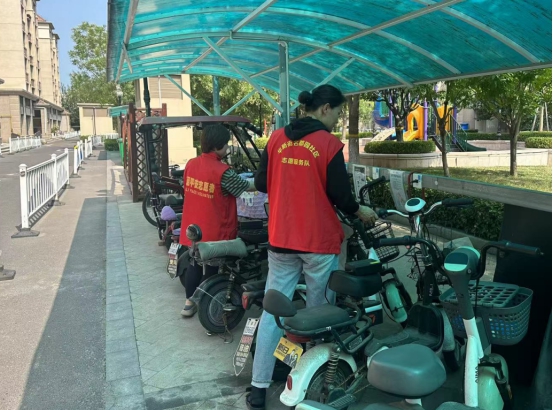 名都园社区兼职网格员对新建电动车充电车棚进行巡查