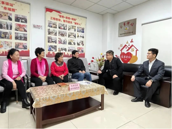 天津市和平区劝业场街兆丰路社区人口密集,居民婚姻家庭、遗产继承等家事纠纷多发。为实现矛盾纠纷早预防、早发现、早化解,助推辖区和谐稳定,街道、社区联合区政法各单位探索将司法服务融入社区日常,打造以“三室联建”+法律服务功能为依托的“家事驿站”,听取居民烦恼诉求,提供专业法律调解服务,让社区成为矛盾纠纷的收取站、化解站,有效营造起平安、幸福的社区生活氛围。