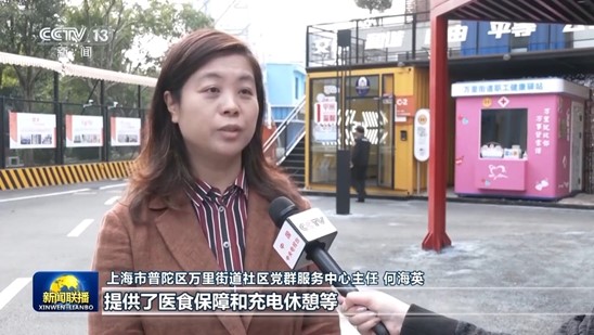 上海市普陀区万里街道社区党群服务中心主任 何海英:除了为外卖、快递小哥等新业态新就业群体提供医食保障、充电休憩等21大类87项专属服务外,我们还为他们提供了交流沟通的“好去处”,更好满足这些上海新“城市建设者”的实际需求。