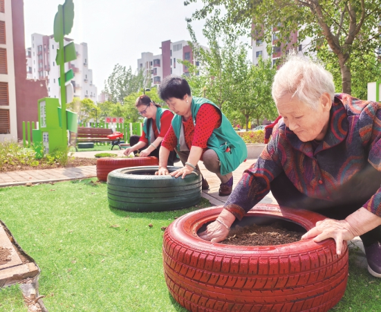 津南区葛沽镇泽水园社区居民收集废弃轮胎,用于培土种花,布置社区花园。天津市津南区委社会工作部供图