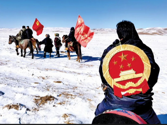 图为2021年12月20日,青海省玛多县人民法院“马背法庭”成员在下乡途中。 新华社记者 柳泽兴/摄