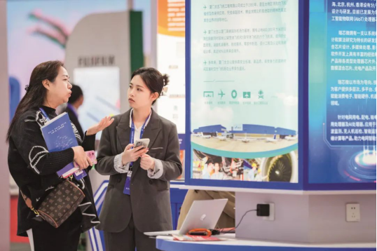 第十二届中国国际服务外包交易博览会在武汉开幕。图为参展企业工作人员向观众讲解展品。本届博览会围绕“数字新机遇 外包新未来”主题,集展览展示、行业对话、商务交流于一体,全方位展示中国服务外包发展成就。 新华社记者 伍志尊/摄