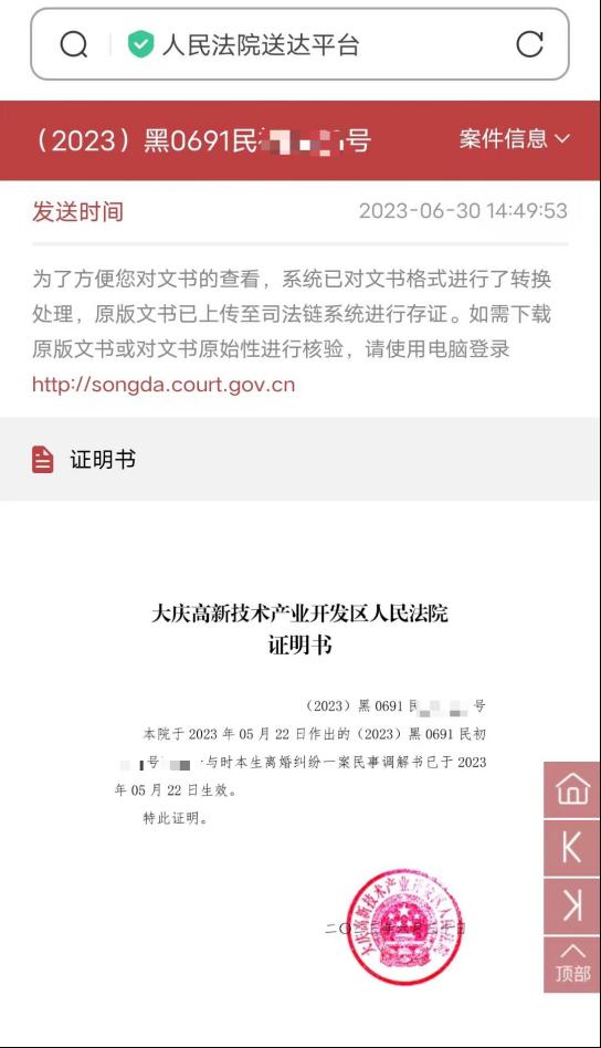 “不用,我现在就处理,给你发电子《生效证明书》,免得你万里奔波。”张法官立即为其出具和送达《裁判文书生效证明书》。