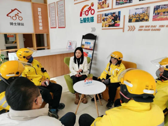 “双向奔赴”激活力按照“五有标准”,社区在银领国际商务楼宇设立了“骑士驿站”,为外卖、快递等新就业群体提供休息饮水、饭菜加热等暖心服务,开展公益义诊、心理辅导、职业培训等专业服务19次。同时,通过选聘“骑先锋”兼职网格员、“公益银行”积分兑换等方式引导他们参与社区治理与服务,发挥“熟门熟路”优势和“红色探头”作用,为社区治理保驾护航,形成“社区服务骑士,骑士融入社区”的“双向奔赴”新格局。