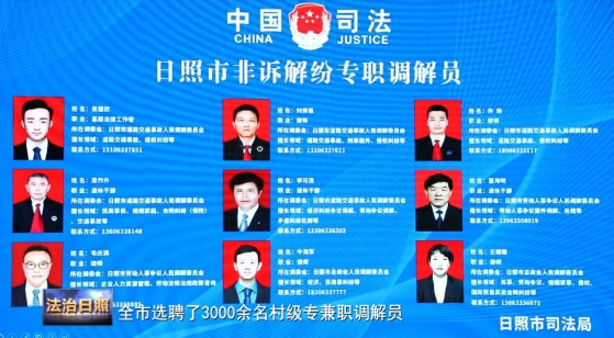 日照市社会治安综合治理服务中心综合协调科科长韩美成说:“我们将“调解优先”作为化解矛盾纠纷的重要环节和第一原则贯彻到矛盾纠纷化解全领域全过程。完善了诉调、访调、检调、警司联调等9大领域调解对接机制,全市选聘了3000余名村级专兼职调解员、545名村居法律顾问参与基层矛盾化解,构筑了四级联动的调解网络。”