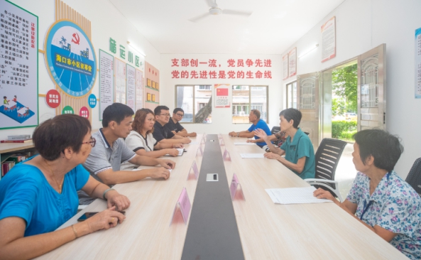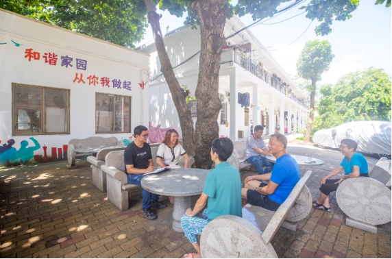 在海口市秀英区海秀街道长秀社区储运小区议事堂,社区工作人员到小区进行走访,了解小区近期工作开展情况 记者符传问 摄
