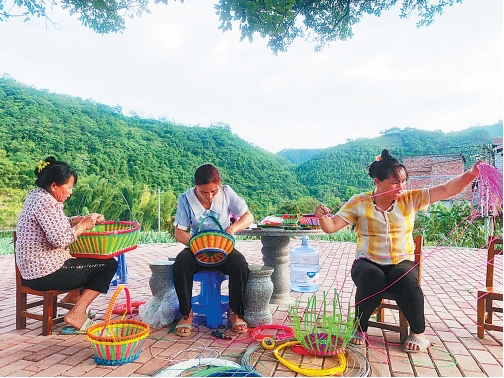 在村口的大榕树下,几名妇女正熟练地编织塑料胶菜篮,这是该屯打造的“庭院经济”项目之一。“我每天可编织塑料胶菜篮子两三个。”村民黄慧芳对记者说。据悉,朔良镇政府正在与对口帮扶的深圳市坪山区马峦街道办联系,把编织好的塑料胶菜篮销往广东,增加村民收入。