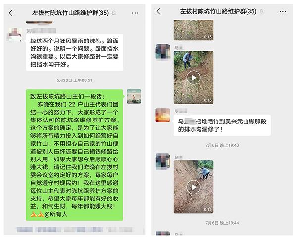 经过两次会议后,方案终于确定。6月27日,在民警的见证下,22位山主在协议上签名并按下手印。会后,阙全旺组建了陈坑竹山路维护群,以便实时了解道路养护情况。