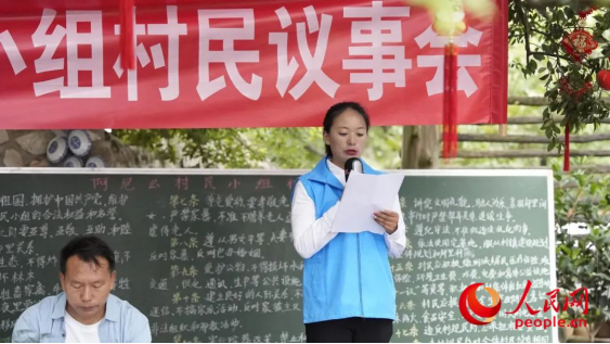 在向阳村阿尼么村小组村民议事会上,李江女(右一)宣读新版村规民约。人民网 周静圆摄
