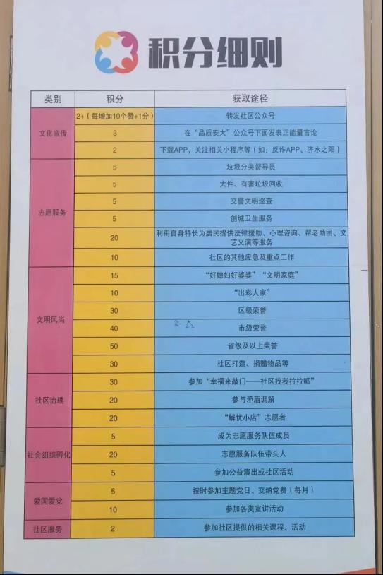 “文明信用积分超市”是安大社区实现“商户—社区—居民”资源链接的重要方式。活动中,商户通过提供资金或其他形式为社区活动提供一定支持,社区在开展各项便民活动中为其宣传;居民通过参与社区建设、社区治理、志愿服务等方式进行信用积分,获得一定分数后便可享受社区服务或兑换生活用品。