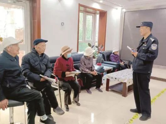 清真巷派出所民警柳杰(右一)兼职凤凰园社区党委副书记,为社区老年人宣讲防电信诈骗、防网络诈骗法律安全知识。