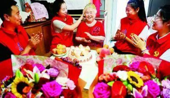 沈阳市多福社区志愿者在辖区独居老人家中为其庆祝生日。资料图片