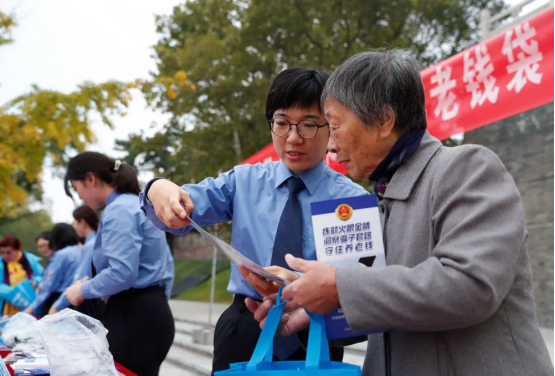 2023年10月22日,江苏省兴化市人民检察院法治宣讲团的工作人员在公园向老年人讲解反诈骗知识。新华社发(周社根摄)