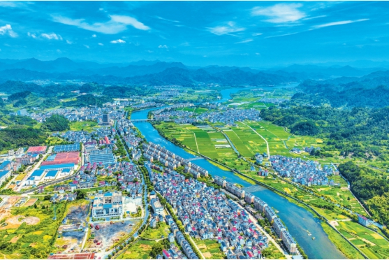浙江在深入实施“八八战略”中坚持和发展新时代“枫桥经验”,推进基层社会治理创新,加强平安浙江、法治浙江建设,走出了一条发展与稳定并行、致富与治安并举、经济与社会并进的新路。图为浙江省杭州市淳安县汾口镇乡村河道蜿蜒,两旁民居错落有致。 视觉中国供图