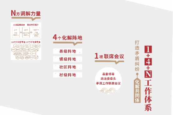 按照做优县级、做强镇街、做实村社的思路,“1+4+N”多元解纷体系日趋完善。“1”是坚持党建引领;“4”是县、乡、社区、村四个调解阵地;N是多元解纷力量。