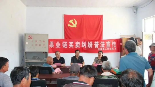 宣判后,沂源法院、沂源县司法局和法律援助中心联合就地举办了一场果业链纠纷答疑讲座,对该案的判决内容进行详细的释法明理。小小的会议室里挤满了涉案的果农和村民。