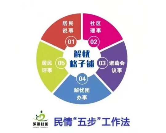 在市民巡访团巡访发现问题,解忧团察访民情解决问题的过程中,滨湖社区形成了巧解社区难题的工作法,建立“居民说事、社区理事、诸葛会议事、解忧团办事、居民评事”的“民情五步工作法”,在社区形成“诸葛议事会”的议事机制,不断延伸服务触角,将服务阵地前移,在网格建立解忧格子铺,将问题化解在小区的网格里,解忧格子铺里解民忧,形成社区治理的“红网格”和“新引擎”。