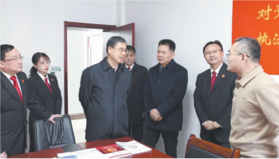 图为2023年12月20日,全国人大代表,山东省高级人民法院党组书记、院长霍敏到聊城市中级人民法院调研案件繁简分流、多元解纷和诉源治理工作。