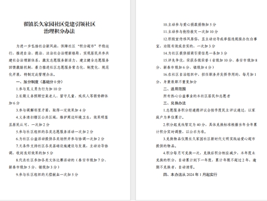新泰市翟镇长久家园社区常住人口5600余人,党员419人,“两委”成员6人。近年来,社区积极探索创优服务群众载体,建立健全志愿服务积分体系,实现志愿服务与群众需求精准对接,有效提升了基层社会治理效能。长久家园社区“积分超市”作为提升基层社会治理水平的有效载体,以“小积分”兑出“大文明”,“小超市”释放“大能量”,搭建了深化社会治理、助推平安创建的崭新平台,让“积分超市”真正成为引领群众、凝聚群众、带动群众、教育群众的生动实践阵地。